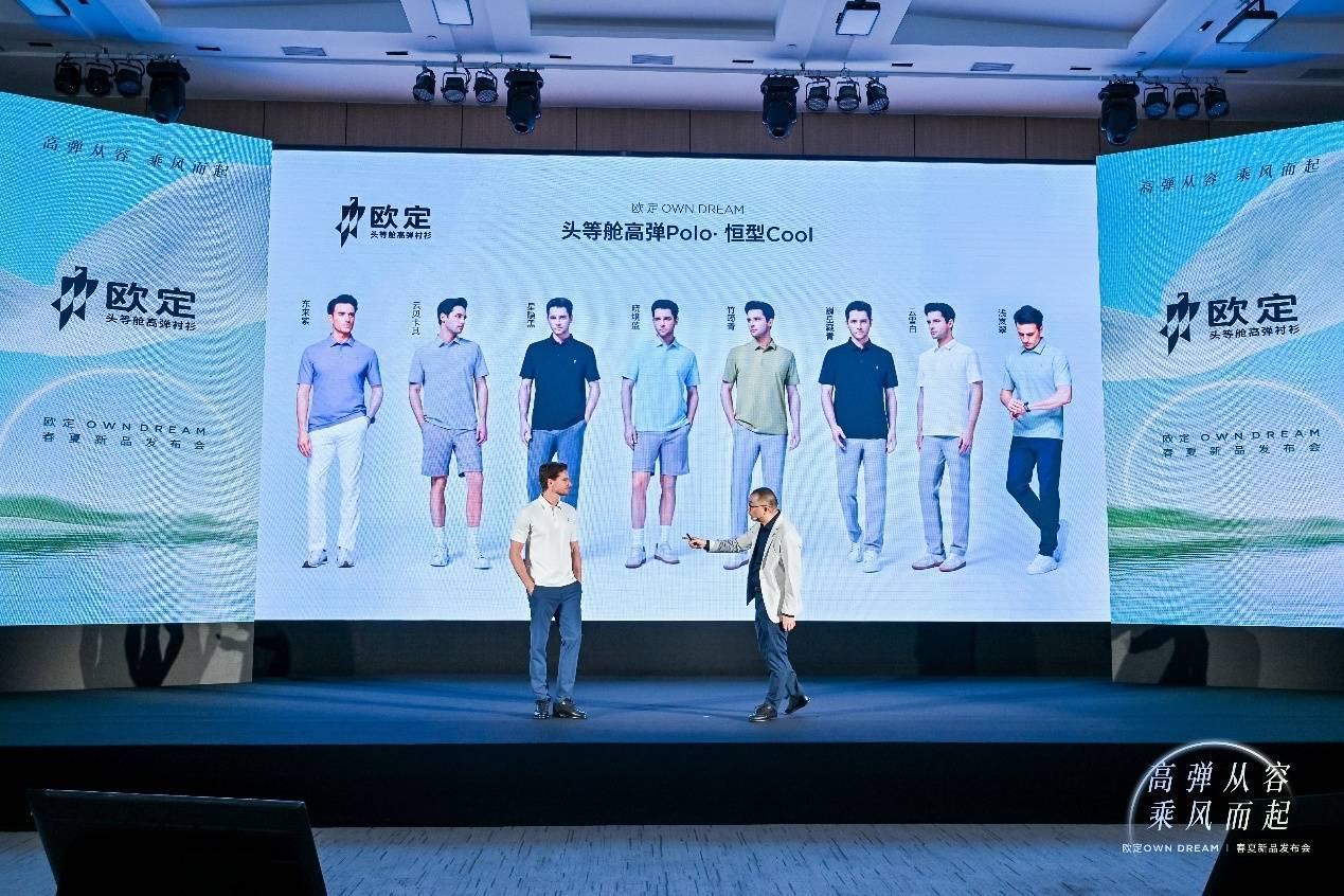发布会上,朱家勇发布了荣获2026riF设计奖的欧定头等舱高弹衬衫,及欧定头等舱高弹Polo、欧定头等舱高弹休闲单西、欧定头等舱高弹休闲裤、欧定头等舱高弹鞋等覆盖商务男装全品类的春夏新品。
