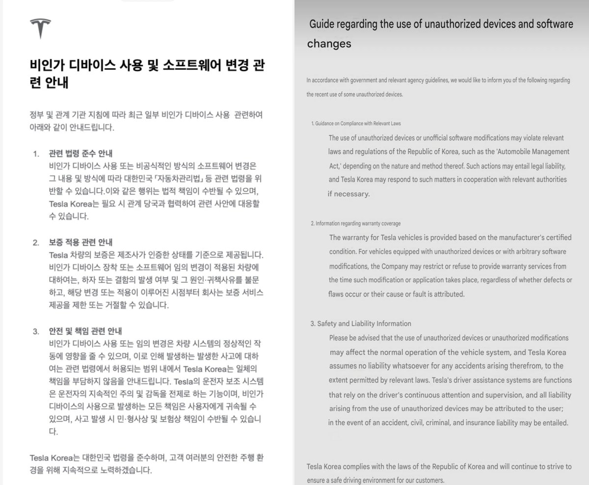 此外,韩国国土、基础设施和交通部也已发布官方警示,将使用这类黑客设备的行为认定为刑事犯罪。依据《汽车管理法》,擅自篡改车辆软件者,最高可判处两年有期徒刑,或处以 2000 万韩元(现汇率约合 91280 元人民币)罚款。特斯拉还将这类设备列为“网络安全威胁”,称其会造成车辆软件漏洞,易被黑客利用攻击。