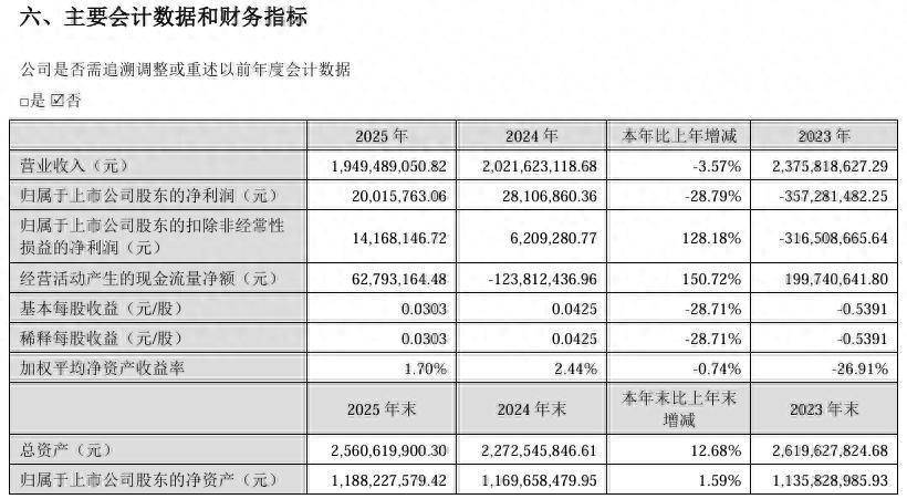 3月27日,荣联科技发布2025年年报。报告显示,公司2025年营业收入为19.49亿元,同比下降3.57%;归母净利润为2001.58万元,同比下降28.79%;扣非归母净利润为1416.81万元,同比增长128.18%;基本每股收益0.03元。
